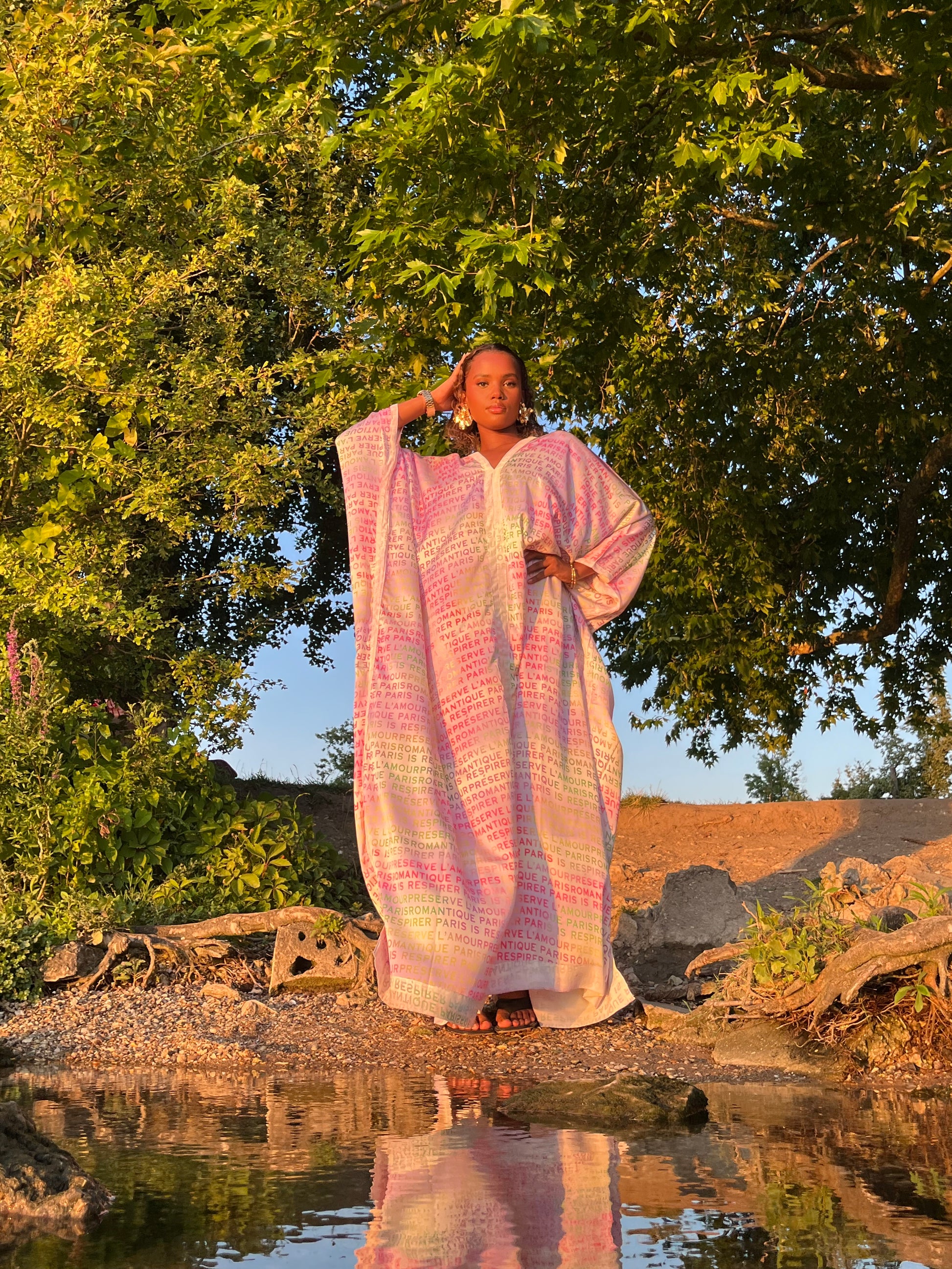 Optez pour un look élégant et romantique avec notre robe légère à motifs. Fabriquée avec un tissu fluide et ornée d'une délicate inscription 'Paris romantique', cette robe mettra en valeur votre silhouette. Les couleurs claires apportent une touche de douceur à cette pièce intemporelle. Faites-vous plaisir avec cette robe parfaite pour toutes les occasions.